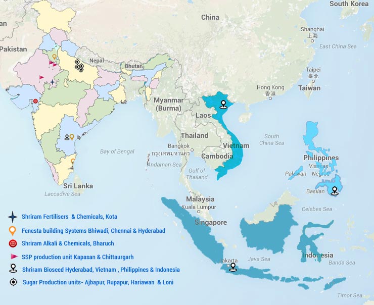 DCM Shriram Sugar factories are located in Ajbapur, Rupapur, Hariawan and Loni in Uttar Pradesh, with a combined installed capacity of 33,000 TCD (tonnes crushed daily) and a power- generating capacity of 115 MW. The Hybrid seed operations- ‘Bioseed’ started in Hyderabad (India) and now have a global footprint with presence in Vietnam, Philippines and Indonesia.